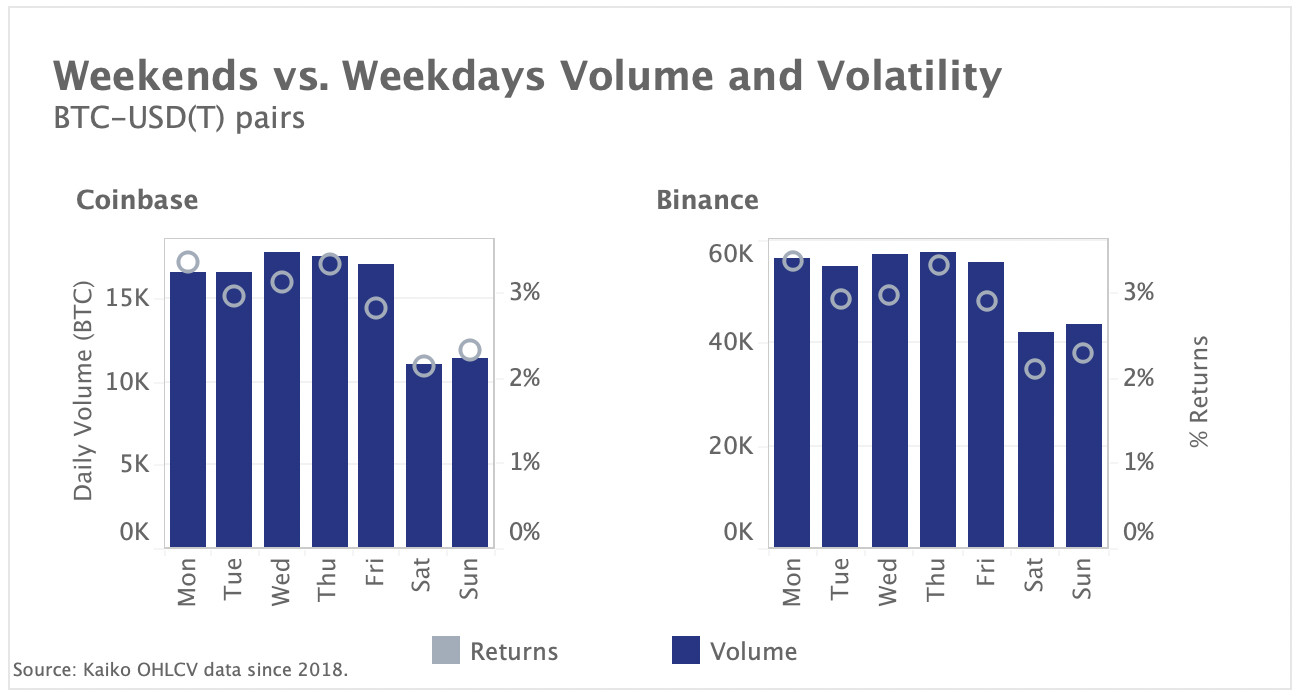 - Volumendynamik: Das Handelsvolumen am Wochenende ist auf Coinbase und Binance deutlich geringer als das Volumen an Wochentagen.