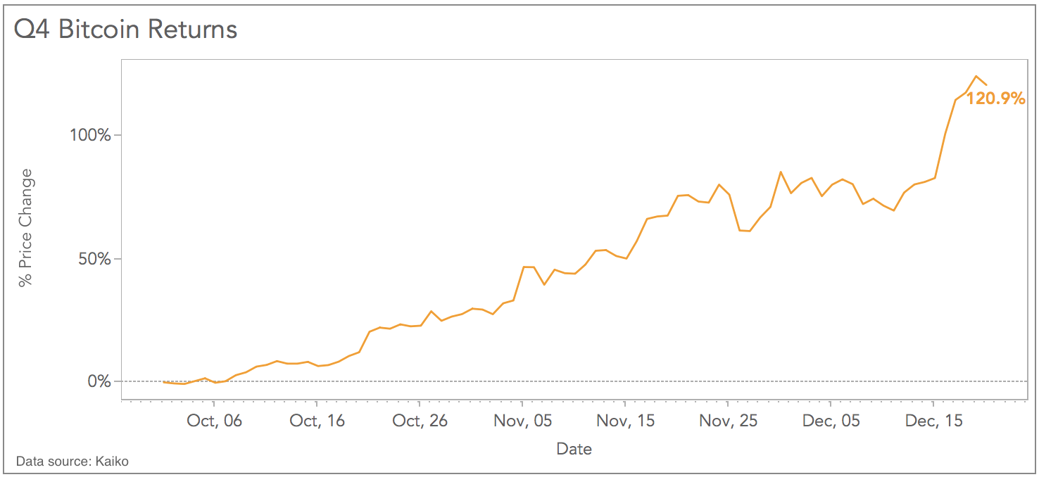 Zum ersten Mal überhaupt durchbrach Bitcoin $20k...und dann $21k...$22k...$23k...$24k. Alles in einer Woche. Dieses Mal erreichte Bitcoin ein neues Allzeithoch an jeder Börse, nicht nur an einigen wenigen. Somit war jeder, der das älteste Krypto-Asset jemals gekauft hat, im Plus. Bitcoins YTD Anstieg liegt bei 219%, doch der Grossteil der Preisbewegungen erfolgte im vierten Quartal. Seit dem 1. Oktober hat Bitcoin den Tag 2/3 Mal im grünen Bereich beendet und bei zwei verschiedenen Gelegenheiten mehr als 9% zugelegt. Das Asset stieg in der vergangenen Woche um mehr als $4'000, eine Rallye, wie man sie seit 2017 nicht mehr gesehen hat.