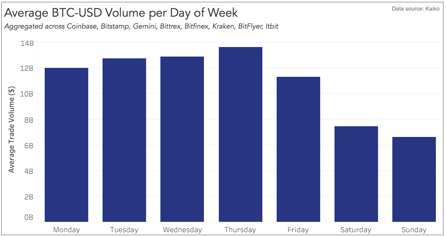 Diese Volumentrends sind den Trends für traditionelle Finanzanlagen sehr ähnlich, was bemerkenswert ist. Denn die Kryptomärkte sind rund um die Uhr geöffnet, während die Aktienmärkte nur unter der Woche und für begrenzte Stunden geöffnet sind. Diese Ähnlichkeiten deuten auf eine institutionelle Präsenz in den Krypto-Märkten hin: Die Händler führen während der Wochentage Transaktionen durch und nehmen die Wochenenden frei.