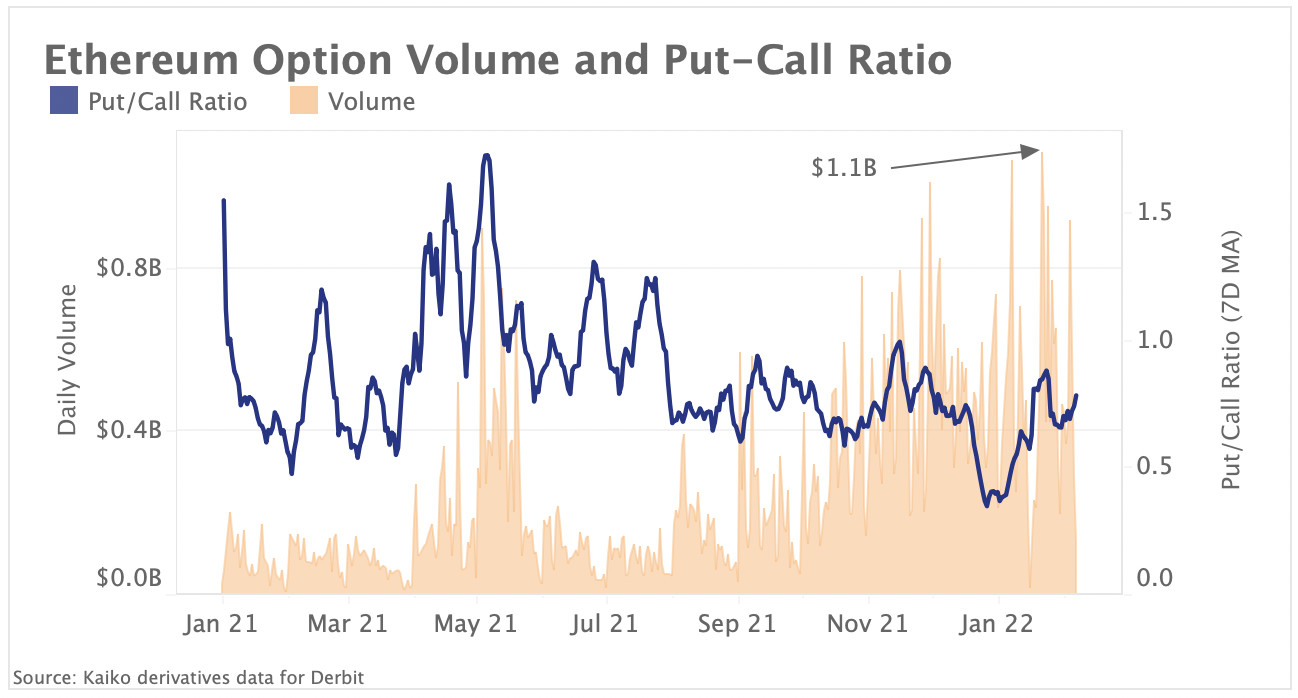 Oben ist das tägliche Handelsvolumen von Ethereum auf Deribit, der grössten Kryptowährungsoptionsbörse, zusammen mit dem Put-Call-Verhältnis dargestellt. Wir stellen fest, dass das tägliche Handelsvolumen seit November sprunghaft angestiegen ist und zwar zusammen mit dem volatilen Put-Call-Verhältnis von Ethereum, welches anhand des Verhältnisses zwischen dem gehandelten Volumen von Puts und Calls berechnet wird. In der Regel wird ein steigendes Verhältnis als bärisch angesehen, da es darauf hindeutet, dass Händler mehr Puts (bärische Wetten) als Calls (bullische Wetten) kaufen. Das Verhältnis zwischen Puts und Calls stieg in der ersten Januarhälfte auf 0.85, bevor es auf 0.78 zurückging, was darauf hindeutet, dass die Optionshändler hinsichtlich der künftigen Preisentwicklung unsicher sind.