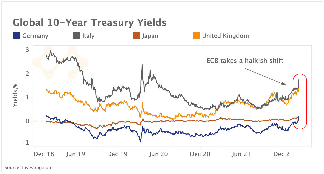 Nachdem die Europäische Zentralbank (EZB) und die Bank of England (BoE) in der vergangenen Woche einen Kurswechsel vollzogen hatten, der zu einem Ausverkauf europäischer Anleihen führte, nahmen die Märkte ihre Wetten auf eine globale Zinserhöhung wieder auf. Die obige Grafik zeigt die Renditen 10-jähriger Staatsanleihen in Italien, Deutschland, dem Vereinigten Königreich und Japan. Wir sehen, dass die Renditen - die sich umgekehrt zu den Kursen bewegen - in allen Ländern auf Mehrjahreshöchststände gestiegen sind. Die Renditen der 10-jährigen italienischen Staatsanleihen verzeichneten den stärksten wöchentlichen Anstieg von über 40 Basispunkten. Die deutschen Renditen drehten zum ersten Mal seit 2019 ins Plus. Die japanischen Renditen erreichten den höchsten Stand seit dem Beginn der Negativzinspolitik des Landes im Jahr 2016. Während der europäische Anleihemarkt im vergangenen Jahr durch die im Vergleich zur US-Notenbank expansivere Haltung der EZB geschützt war, hat der jüngste Schritt der EZB die Anleger dazu veranlasst, die Zinserwartungen aggressiv neu zu bewerten. Dies wird zu den grassierenden Ängsten vor einer Verschärfung der Geldpolitik und der Risikoaversion beitragen, die in den letzten Monaten risikoreichere Anlagen nach unten gezogen haben.