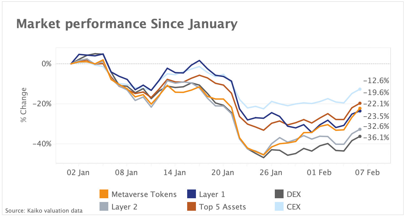 Im Gegensatz dazu schnitten die dezentralen Börsen-Token (DEX) mit einem Rückgang von über 36% am schlechtesten ab. Trotz der enttäuschenden Quartalsergebnisse von Meta in der vergangenen Woche haben Metaverse-bezogene Token an Boden gewonnen und sich besser entwickelt als Layer 1- und Layer 2-Skalierungslösungen. Die meisten Layer-1-Token haben nach dem Hack von Wormhole in der vergangenen Woche einen Rückschlag erlitten, was darauf hindeutet, dass eine interoperable Multi-Chain-Zukunft noch lange nicht Realität ist.