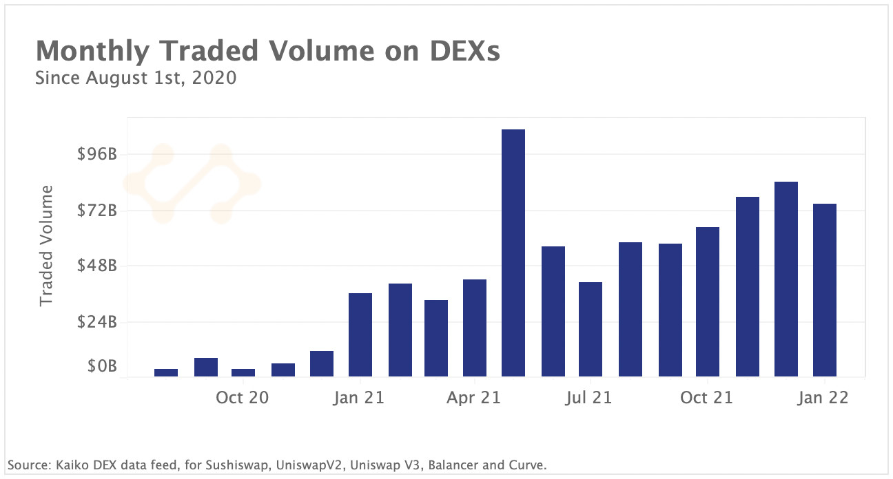 Das Handelsvolumen auf den führenden Ethereum-basierten DEXs ist im Januar auf 75 Mrd. US-Dollar gesunken, parallel zum allgemeinen Abschwung auf dem Kryptomarkt. Der Rückgang war vor allem auf die sinkende Handelsaktivität bei Uniswap zurückzuführen, auf die heute 80% des Gesamtvolumens entfallen. Die Handelsaktivität auf Curve, einem DEX, der für Stablecoin-Swaps optimiert ist, widersetzte sich dem Trend und verzeichnete einen Anstieg des Volumens von 5 Mrd. Dollar im Dezember auf 9 Mrd. Dollar im Januar, da die Anleger auf der Suche nach Stablecoin-Liquidität zu dieser Börse strömten.
