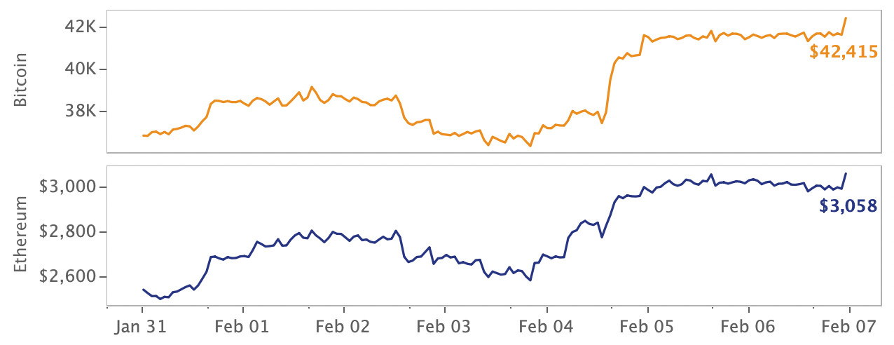 - Preisbewegungen: Bitcoin wurde zum ersten Mal seit Mitte Januar über 42'000 Dollar und Ethereum über 3'000 Dollar gehandelt.
