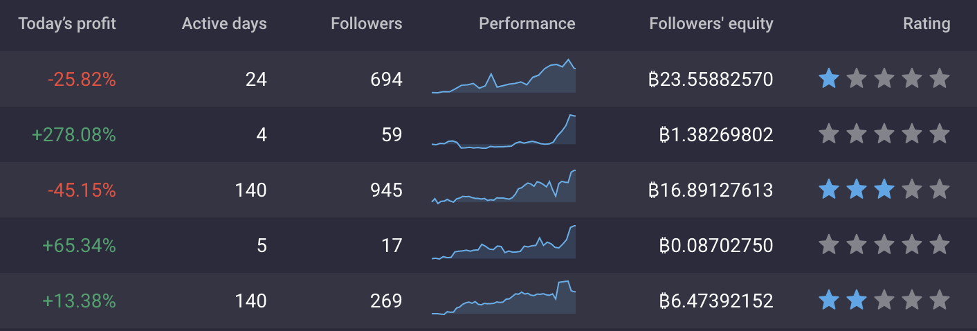 Covesting ist nur über PrimeXBT verfügbar, eine preisgekrönte Kryptowährungs-Margin-Handelsplattform, die auch CFDs auf Aktienindizes, Gold- und Ölhandel, Devisen und vieles mehr anbietet. Melden Sie sich noch heute an und sehen Sie sich das Fünf-Sterne-Ratingsystem an, um alle wichtigen Kennzahlen zu entdecken und sicherzustellen, dass Sie die für Sie ideale Strategie wählen.