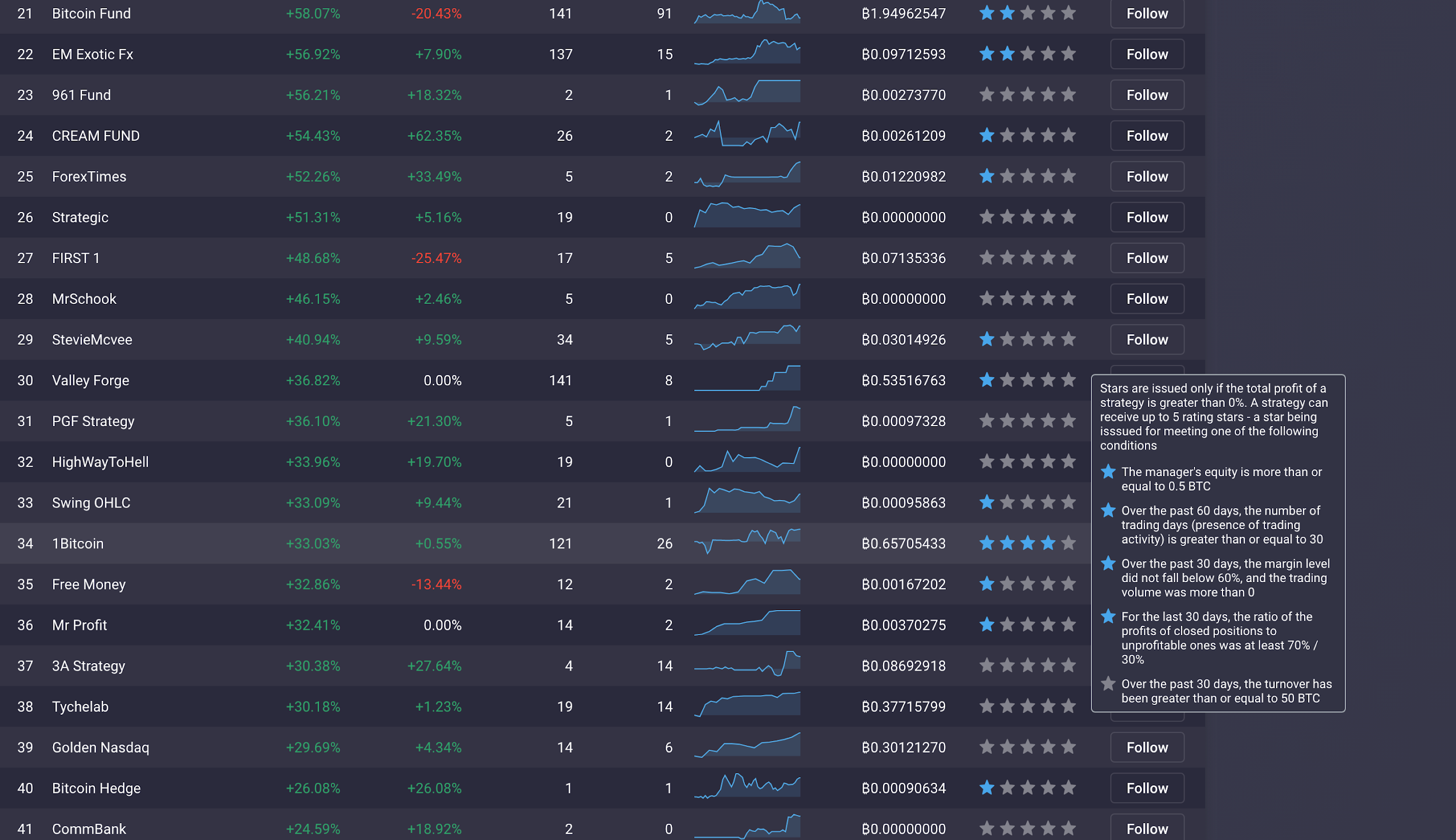 Die Strategien müssen eine Mindesteinlage von 0,5 BTC an Manager-Eigenkapital erfüllen, um einen Stern zu erhalten, wobei auch für diejenigen, die kleiner starten wollen, Eigenkapital durch den Handel verdient werden kann. Ein zweiter Stern wird an diejenigen vergeben, die an mindestens 30 von 60 der vergangenen Tage einen Handel getätigt haben, und ein dritter für diejenigen mit mindestens 50 BTC Umsatz. Allein diese drei Sterne sollen sicherstellen, dass die Händler zumindest ein gewisses Mass an Handelsaktivität und Engagement für regelmässiges Handel zeigen.