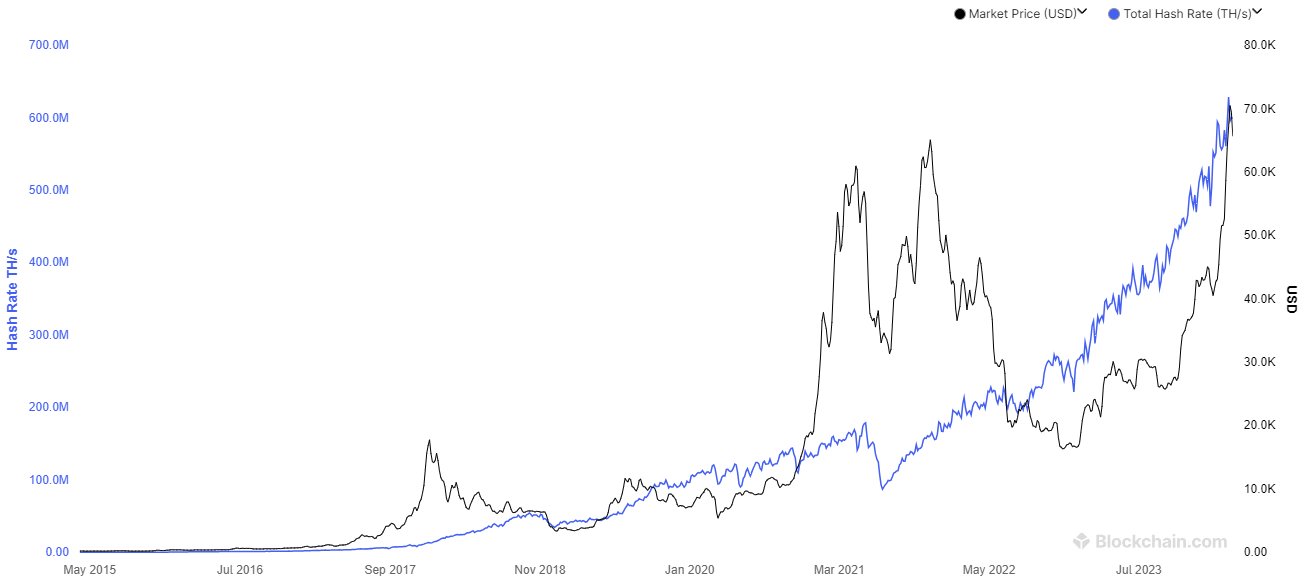 Das Bitcoin-Mining erfordert eine beträchtliche Menge an Energie, sowohl für die Rechenaufgaben als auch für die Kühlung der beteiligten Computer. Infolgedessen neigt die Mining-Industrie dazu, Standorte mit billigerem Strom zu bevorzugen. Die Kosten für das Bitcoin-Mining sind ausserdem abhängig von den Ausgaben für die Ausrüstung, den Strom und die Einrichtungen, in denen die Hardware untergebracht ist. Wenn die Belohnungen der Miner halbiert werden, muss sich der Bitcoin-Preis verdoppeln, um eine ähnliche Rentabilität wie vor dem Halving zu erreichen. Trotz der letzten beiden Halvings und harten Rückschlägen in China ist die gesamte Rechenleistung, die dem Netzwerk zur Verfügung steht, weiterhin stetig gestiegen und erreicht wöchentlich neue Höchststände.