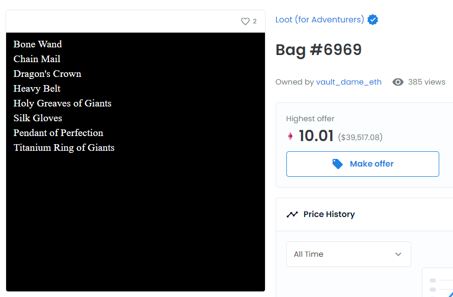 Wie wurden diese Loot-Bags verteilt? Der Erfinder, Dom Hofmann, hat sie Ende August kostenlos verteilt. Man musste nur die Transaktionsgebühren bezahlen, um sie zu prägen. Es gab jedoch keine weiteren Details oder Informationen über sie. Auch keine Web3-Anwendung (zumindest anfangs). Als kleine Randnotiz für alle, die nur das Geld interessiert: Der aktuelle Mindestpreis liegt bei 13.5 Ether (ETH)!