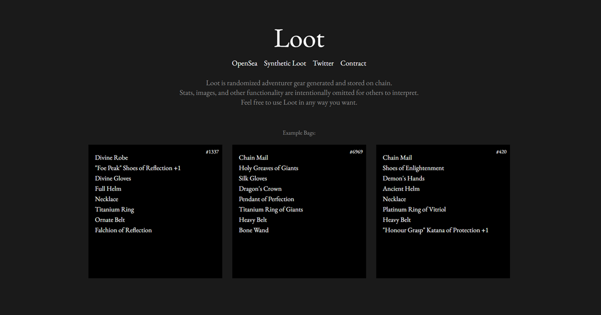 Der Bottom-up-Ansatz bei Loot ist jedoch anders. Der Wert des NFT ist nicht an eine einzelne Einheit oder Person gebunden. Um bei der Analogie des Hauses zu bleiben, sind die Loot-Bags in diesem Fall die Ziegelsteine. Die Nutzer können entscheiden, ob sie damit ein Haus, eine Brücke oder ein Stadion bauen wollen.