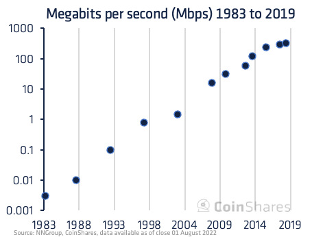 Der Grund dafür ist, dass die Bandbreite der Verbraucher jedes Jahr um etwa 50% zunimmt (ähnlich dem Mooreschen Gesetz). Angesichts dieses exponentiellen Wachstums würde es etwa fünf bis sechs Jahre dauern, um eine 10-fache Steigerung der Bandbreite zu erreichen (und weitere 5 Jahre für eine 100-fache Verbesserung). Es gibt guten Grund zu der Annahme, dass sich die Bandbreite weiterhin in diesem Tempo verbessern wird, da die Bandbreite ein inhärent parallelisierbarer Prozess ist. Im Folgenden wird das Wachstum der Bandbreite von 1983 bis 2019 dargestellt.